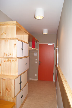 Die Zimmer verzichten auf das klassiche Mobilia. Stühle sind durch Rollkisten ersetzt, in denen noch persönliche Utensilien untergebracht werden können.
