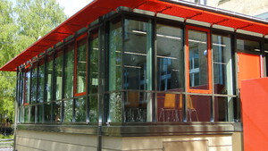 Im Gegensatz zur massiven Gebäudehülle des Versorgungsbereiches, wird der Aufenthaltsraum von einer Pfosten-Riegel-Fassade mit farbigen Akzenten eingefasst,