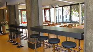 Der Aufenthaltsraum ist nach Nordwesten zum Campus hin ausgerichte, der Versorgungsbereich zum Innenhof. Der Niveauunterschied Campus / Neubau wird durch eine seitlich angeordnete Treppe bzw. einen behindertengerechten Hublift überwunden, deren markanten Betonstützwände den Neubau einrahmen und die Verbindung zu den Außenplätzen herstellen.
