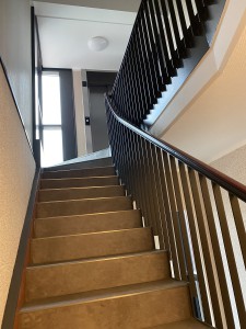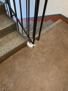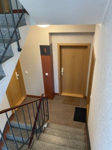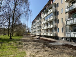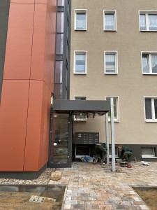 Nach dem Aufzugsanbau und der erfolgten Aufstockung wurden die Treppenhäuser malermäßig instand gesetzt. Im neuen Hauseingangsbereich wurden Fliesen im Bodenbereich verlegt. Die Wände erhielten Wandschutz. Vor dem Eingang erfolgt der Einbau von Fahrradständern. Die Außenanlagen wurden nach Abschluss der Arbeiten komplett wieder hergerichtet. Es erfolgte die Herstellung von neuen Zuwegungen zu den Hauseingängen und angrenzenden Pflanzflächen. Hierbei wurde das Gelände höhenmäßig so angepasst, dass die Aufzüge barrierefrei erreichbar sind. In den Giebelbereichen des Hauses erfolgte die Aufstellung von einer Fahrradgarage für jeweils 24 Fahrräder. Gleichzeitig wurden eine neue Feuerwehrzufahrt sowie Leiteraufstellflächen auf der Balkonseite hergestellt.